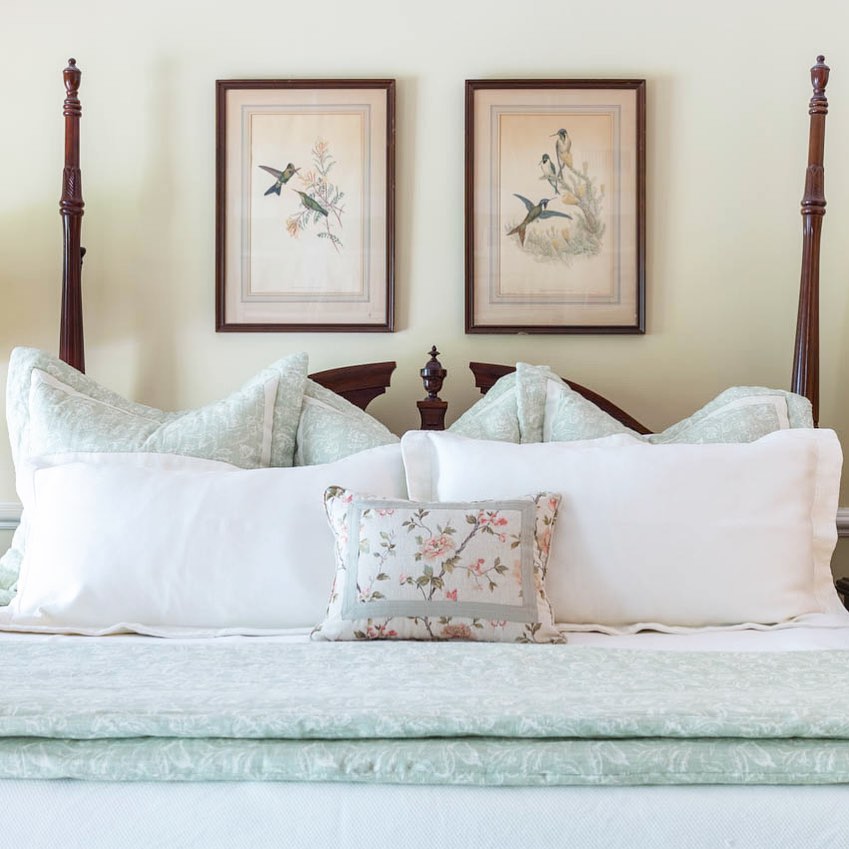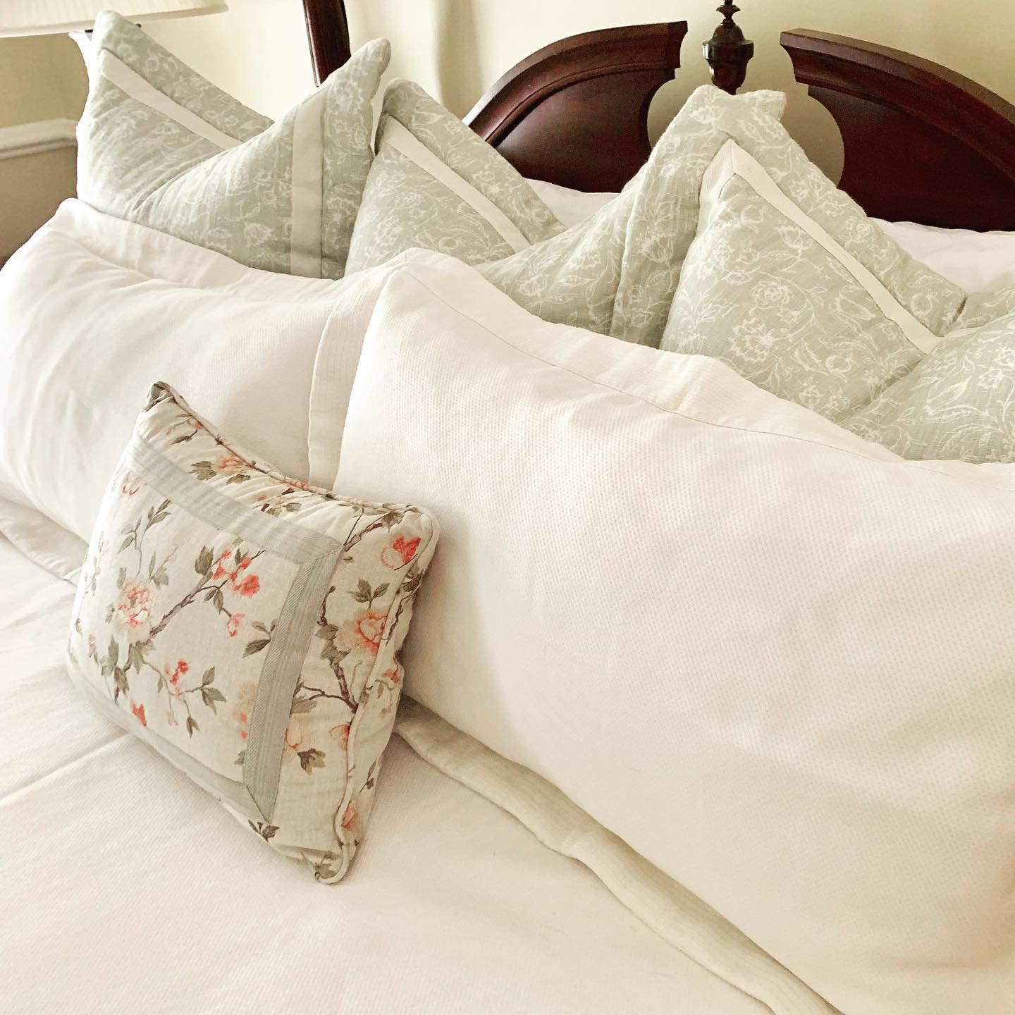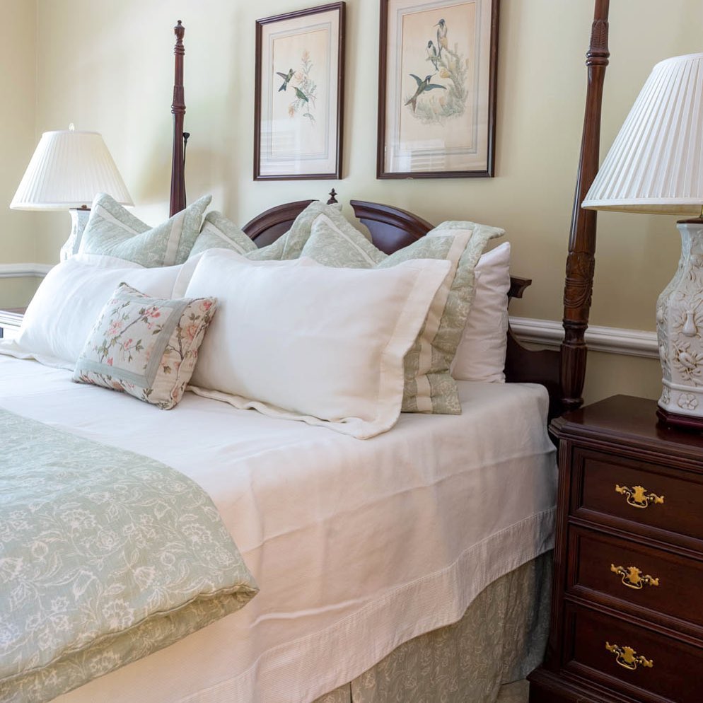 Refreshes in this home include custom chairs in the den, new seat cushions for breakfast chairs, and reupholstered furniture in the living room. New bedding including a custom bedskirt and pillows brought in one of the homeowner’s favorite colors, a light sage green.