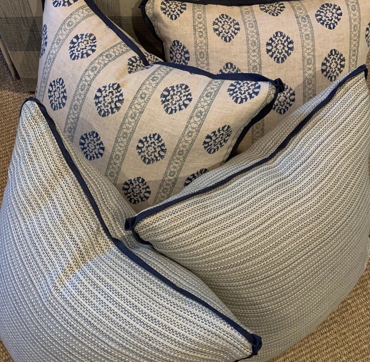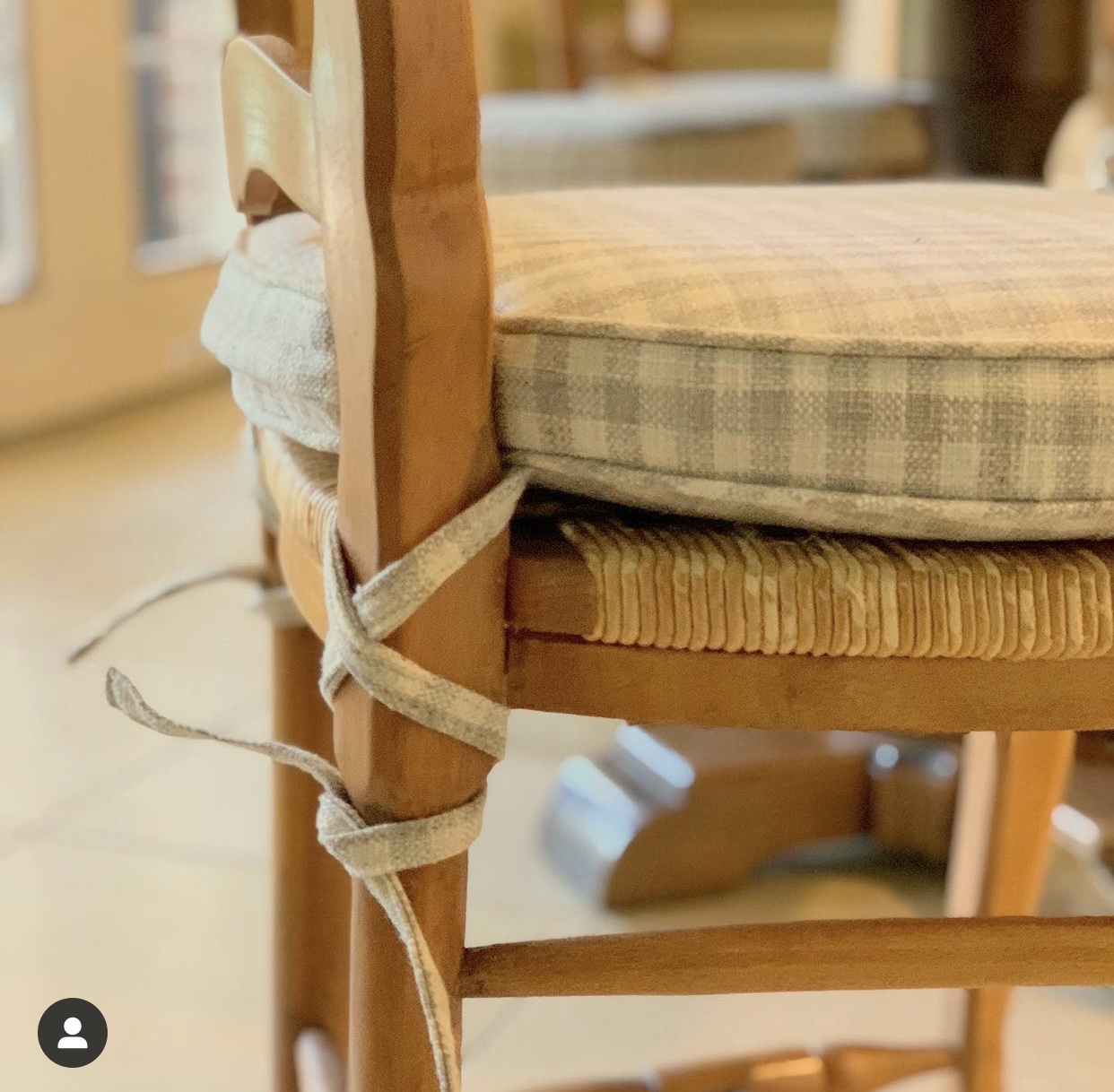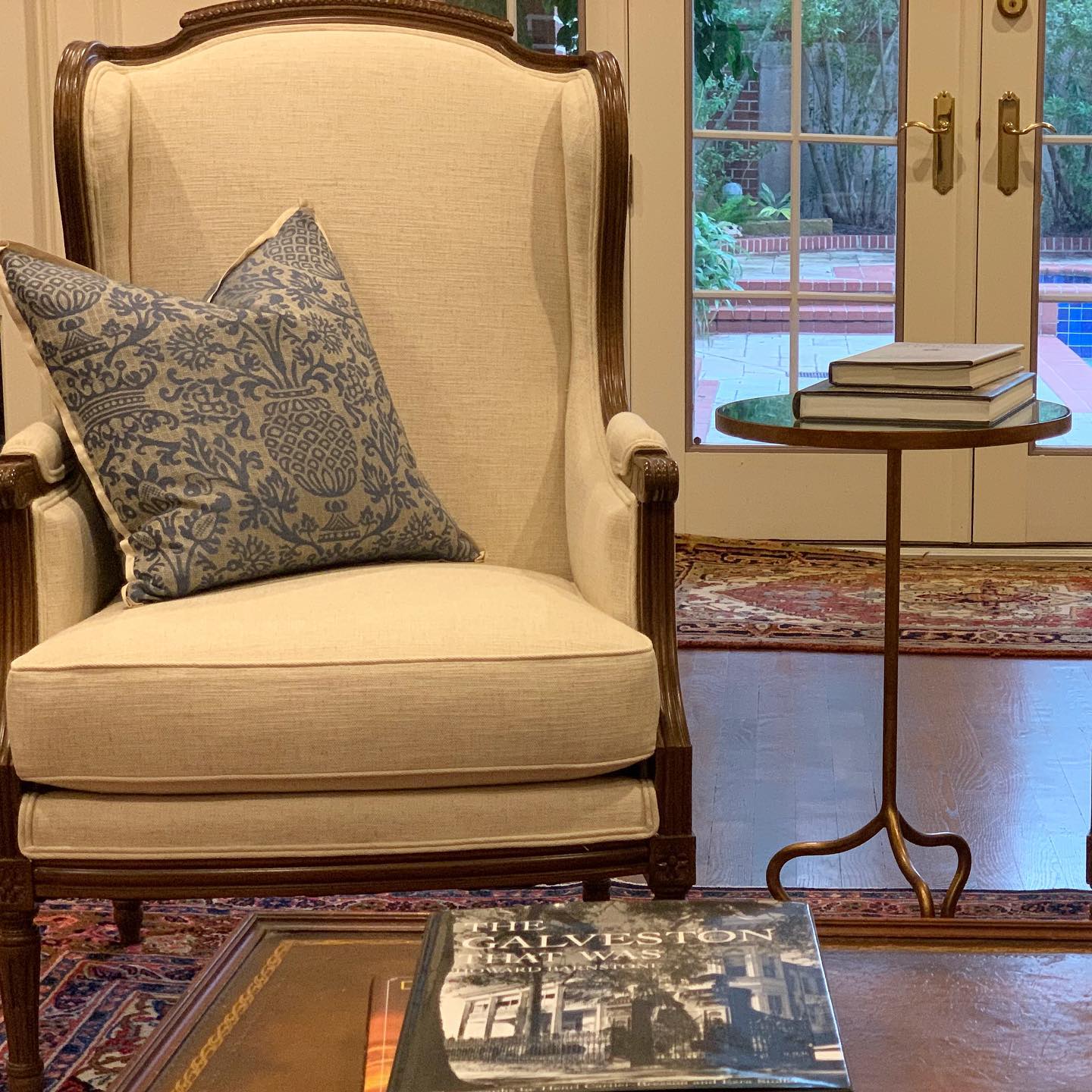 Refreshes in this home include custom chairs in the den, new seat cushions for breakfast chairs, and reupholstered furniture in the living room. New bedding including a custom bedskirt and pillows brought in one of the homeowner’s favorite colors, a light sage green.