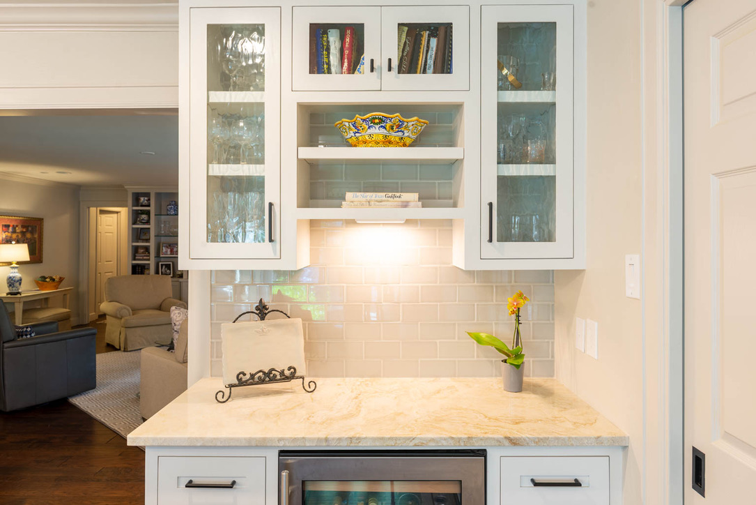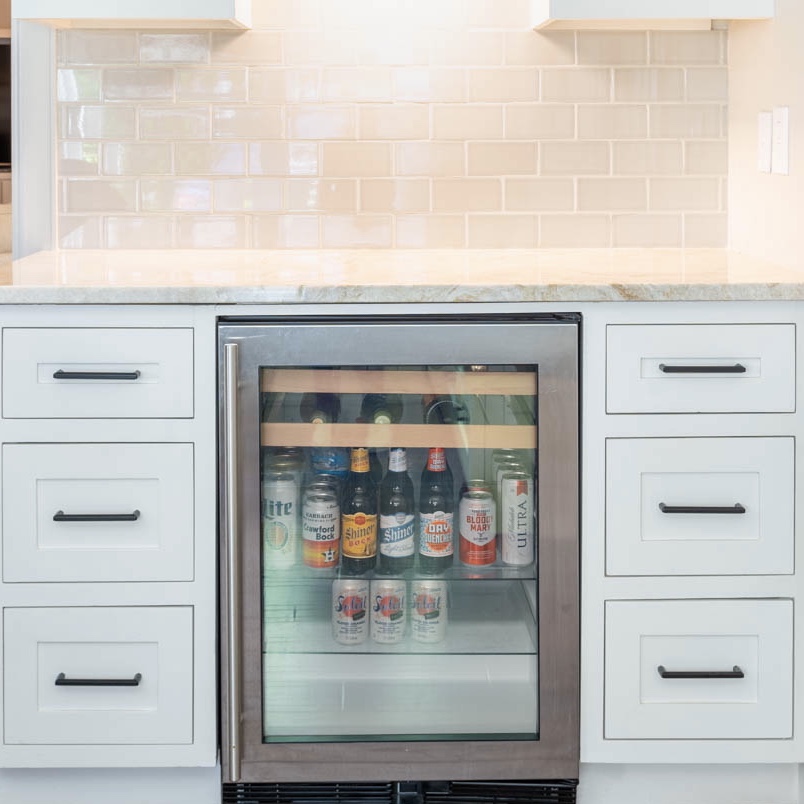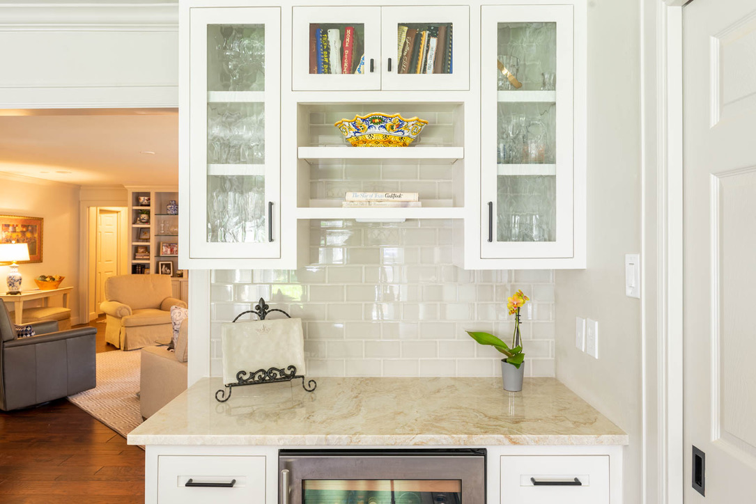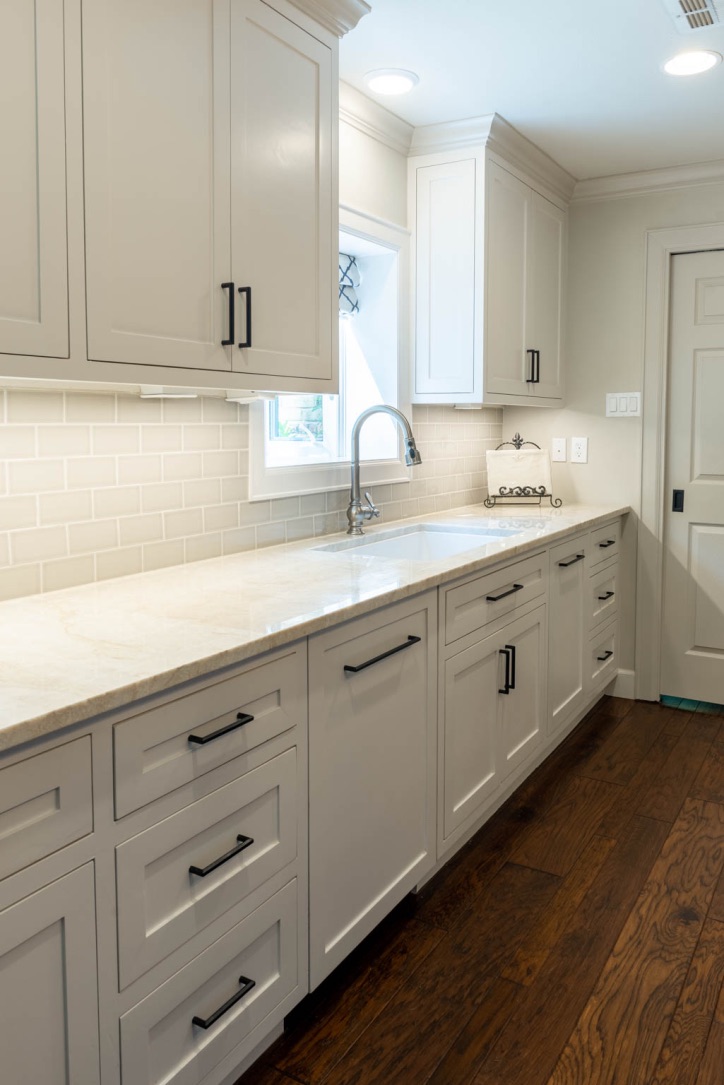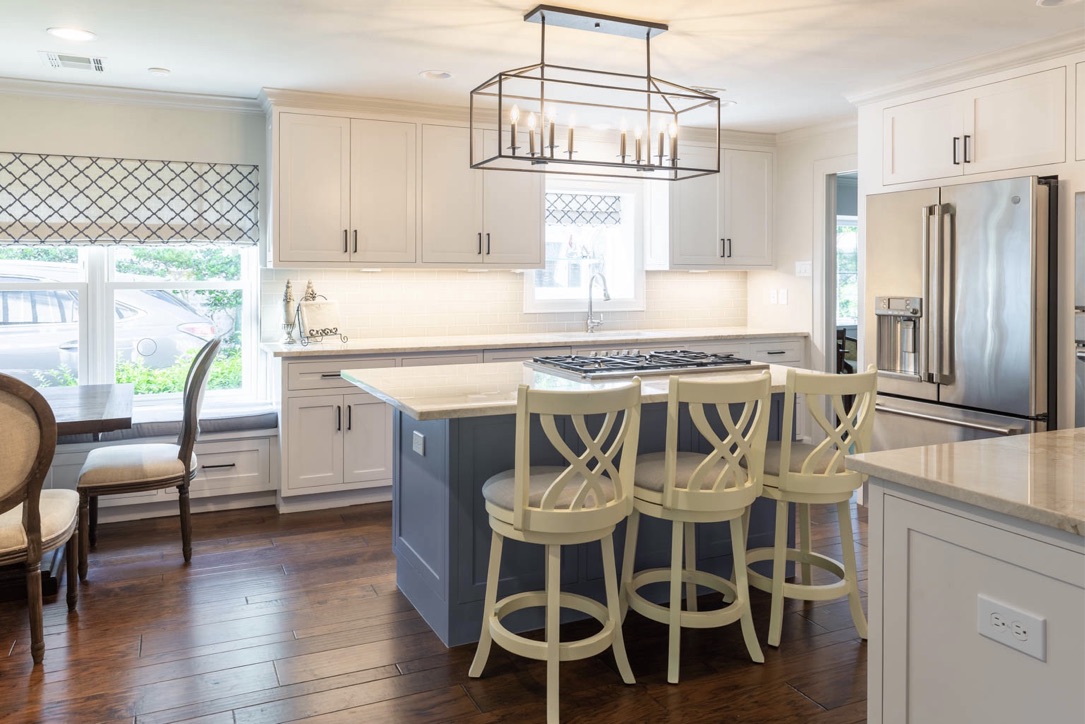 This project encompassed a comprehensive gut remodel of several key areas. The kitchen was transformed by opening it up to the living room and adding a stylish island, creating a more open and functional space. The hall bathroom was also completely remodeled, with the addition of a linen cabinet on top of the counter for enhanced storage. In the powder room, new flooring was selected to complement the client’s chosen wallpaper, adding a touch of elegance. Finally, the primary bathroom underwent a full remodel to modernize and upgrade its features.