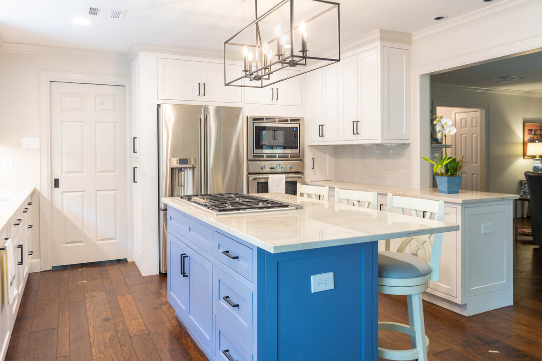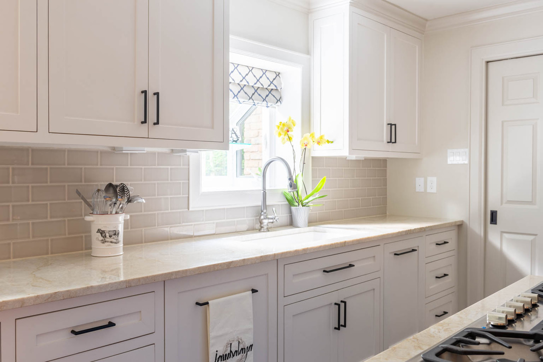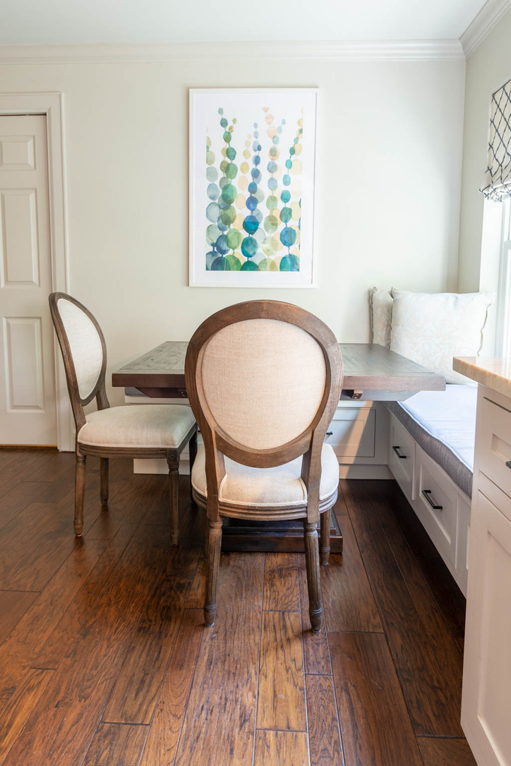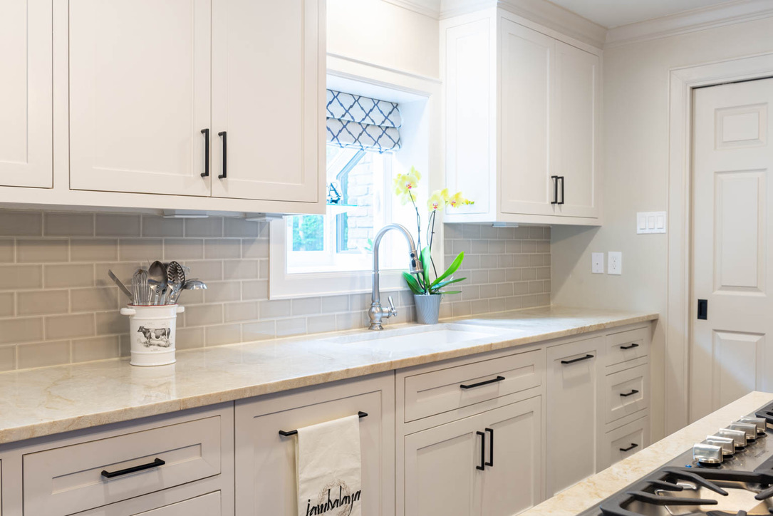 This project encompassed a comprehensive gut remodel of several key areas. The kitchen was transformed by opening it up to the living room and adding a stylish island, creating a more open and functional space. The hall bathroom was also completely remodeled, with the addition of a linen cabinet on top of the counter for enhanced storage. In the powder room, new flooring was selected to complement the client’s chosen wallpaper, adding a touch of elegance. Finally, the primary bathroom underwent a full remodel to modernize and upgrade its features.
